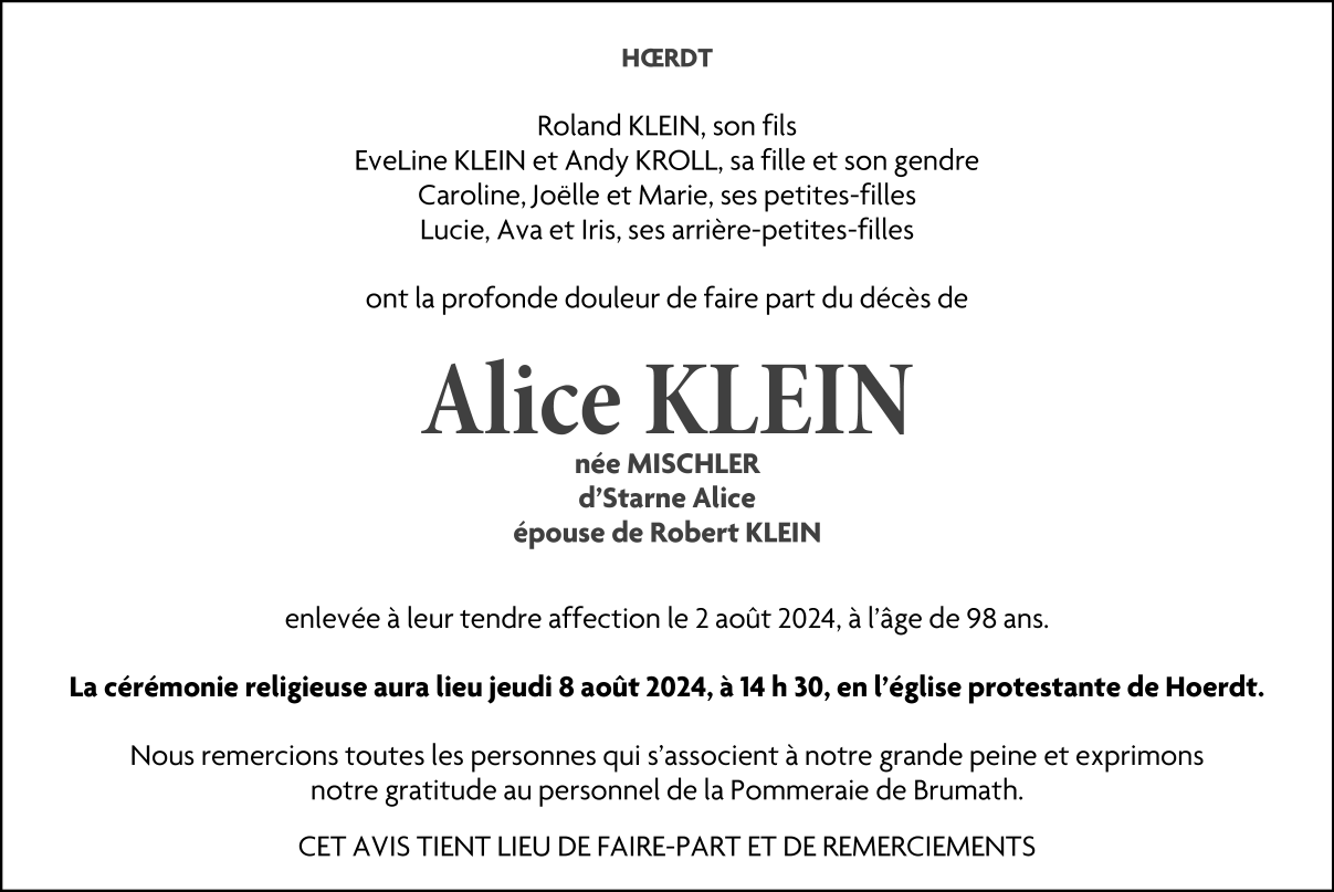 Décédée à Brumath (67170, France) le vendredi 2 août 2024 à l'âge de 98 ans