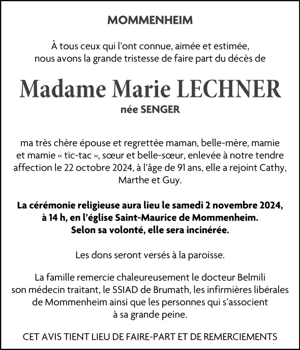 Décédée à Mommenheim (67670, France) le mardi 22 octobre 2024 à l'âge de 91 ans