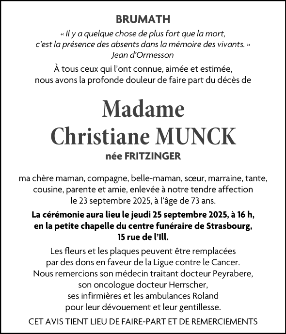 Décédée à Brumath (67170, France) le mardi 23 septembre 2025 à l'âge de 73 ans