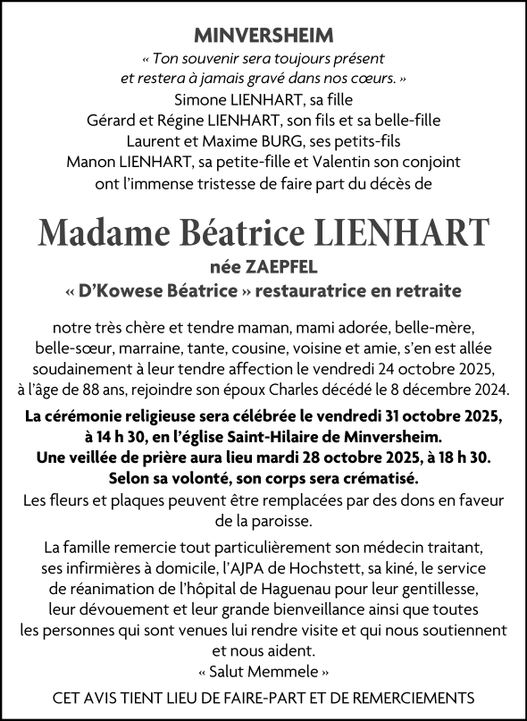 Madame Marie Anne Béatrice LIENHART née ZAEPFEL