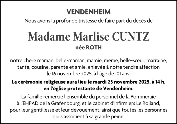 Décédée à Brumath (67170, France) le dimanche 16 novembre 2025 à l'âge de 101 ans