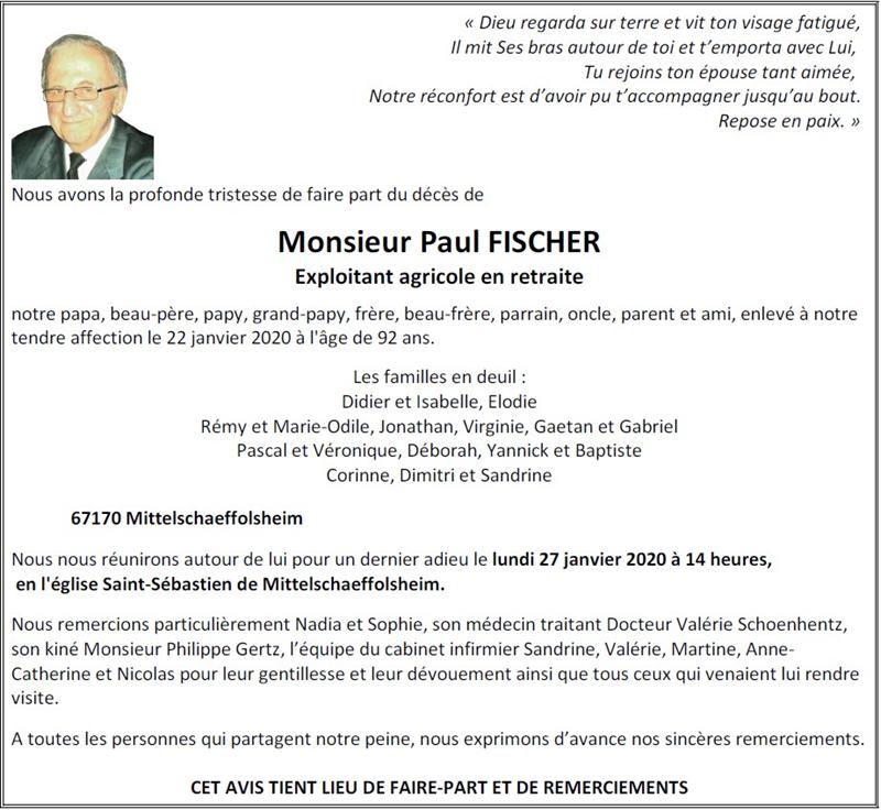 Décédé à Mittelschaeffolsheim (67170, France) le mercredi 22 janvier 2020 à l'âge de 92 ans