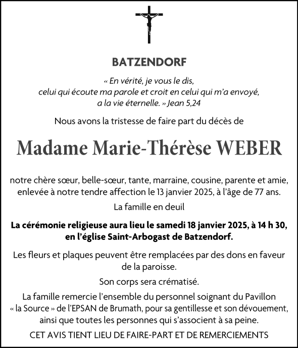 Décédée à Brumath (67170, France) le lundi 13 janvier 2025 à l'âge de 77 ans