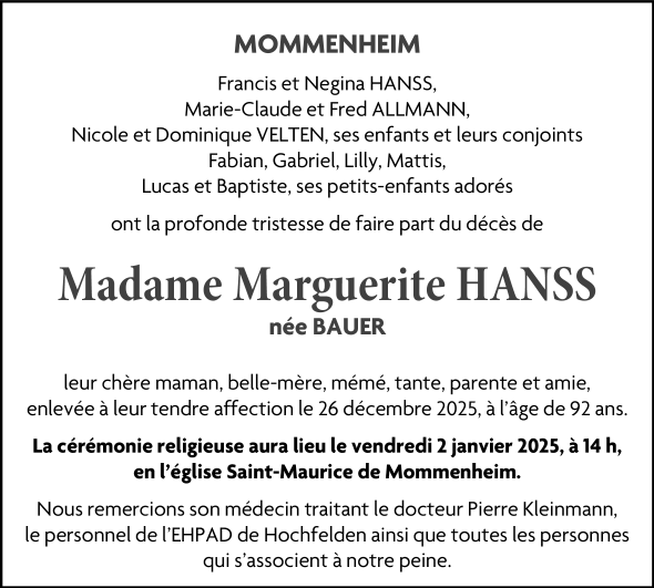 Décédée à Hochfelden (67270, France) le vendredi 26 décembre 2025 à l'âge de 92 ans