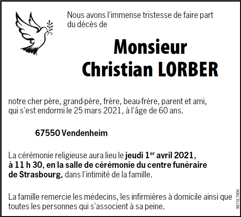 Décédé à Vendenheim (67550, France) le jeudi 25 mars 2021 à l'âge de 60 ans