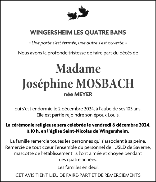Décédée à Saverne (67700, France) le lundi 2 décembre 2024 à l'âge de 102 ans
