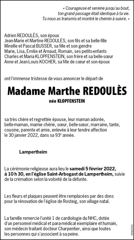 Madame Marthe REDOULES née KLOPFENSTEIN