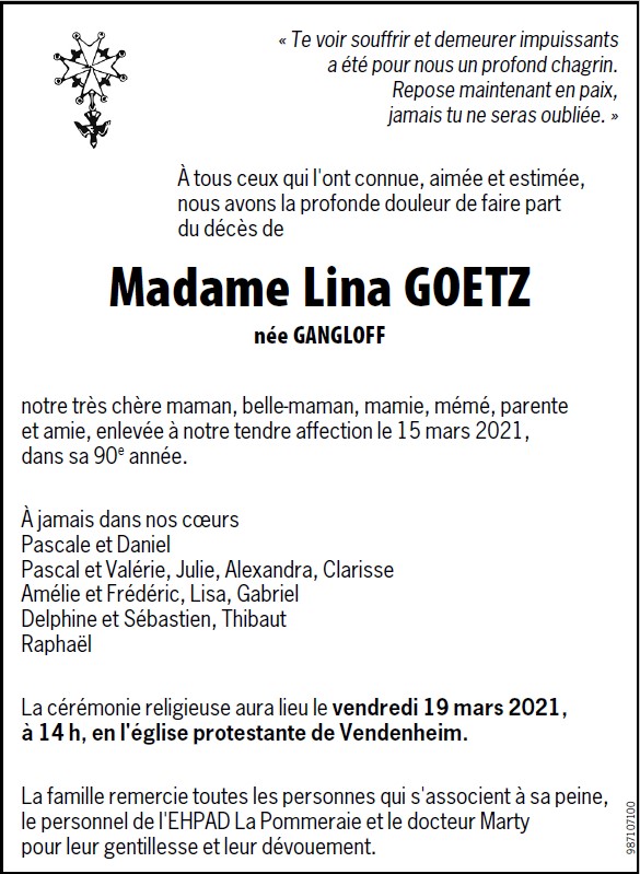 Décédée à Brumath (67170, France) le lundi 15 mars 2021 à l'âge de 89 ans