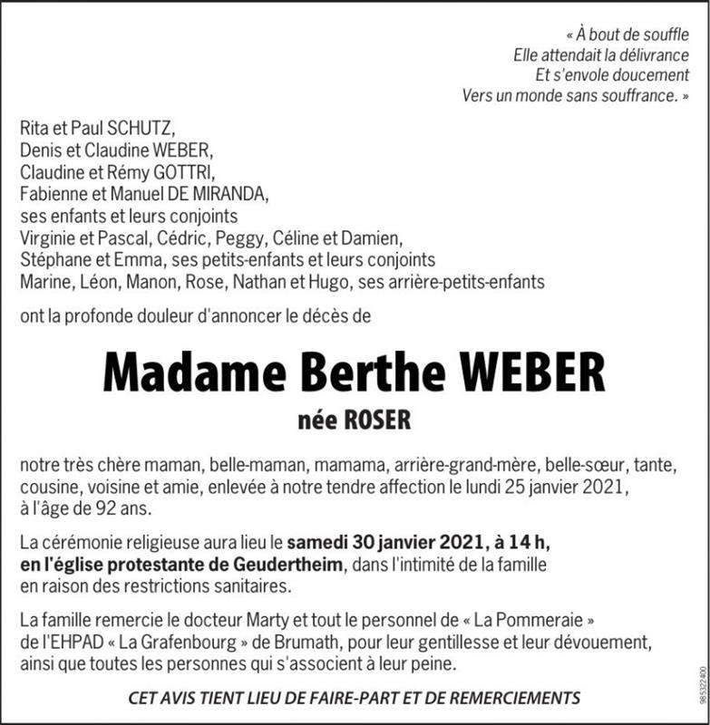 Décédée à Brumath (67170, France) le lundi 25 janvier 2021 à l'âge de 92 ans