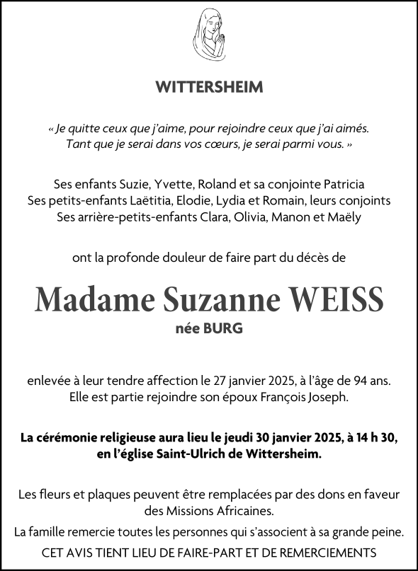 Décédée à Wittersheim (67670, France) le lundi 27 janvier 2025 à l'âge de 94 ans