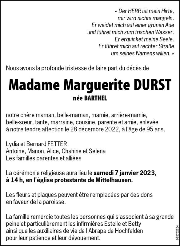 Décédée à Wingersheim les quatre Bans (67170, France) le mercredi 28 décembre 2022 à l'âge de 95 ans