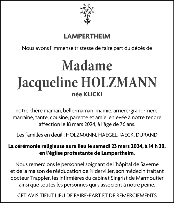 Madame Jacqueline Marguerite Sophie HOLZMANN née KLICKI