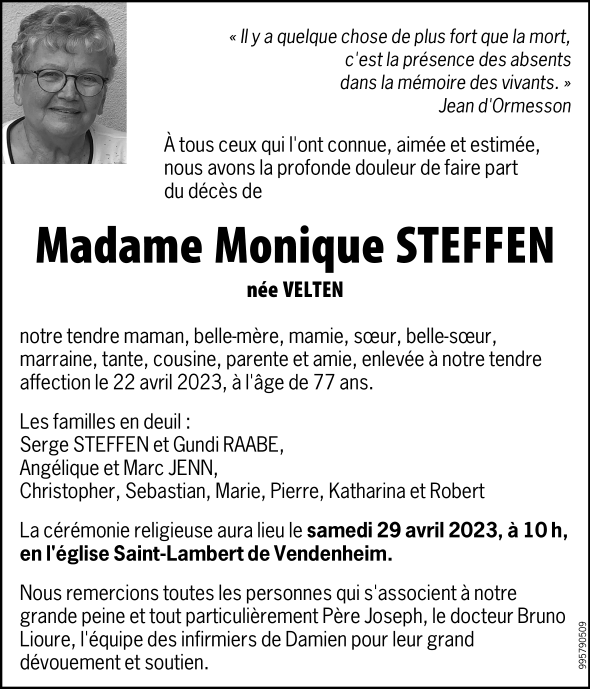 Madame Monique Mathilde Marguerite STEFFEN née VELTEN