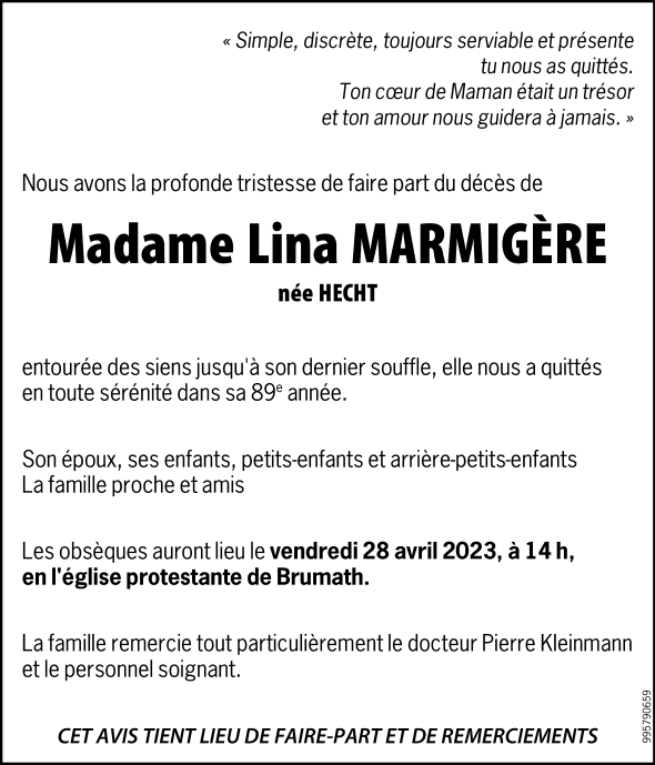 Décédée à Brumath (67170, France) le lundi 24 avril 2023 à l'âge de 88 ans