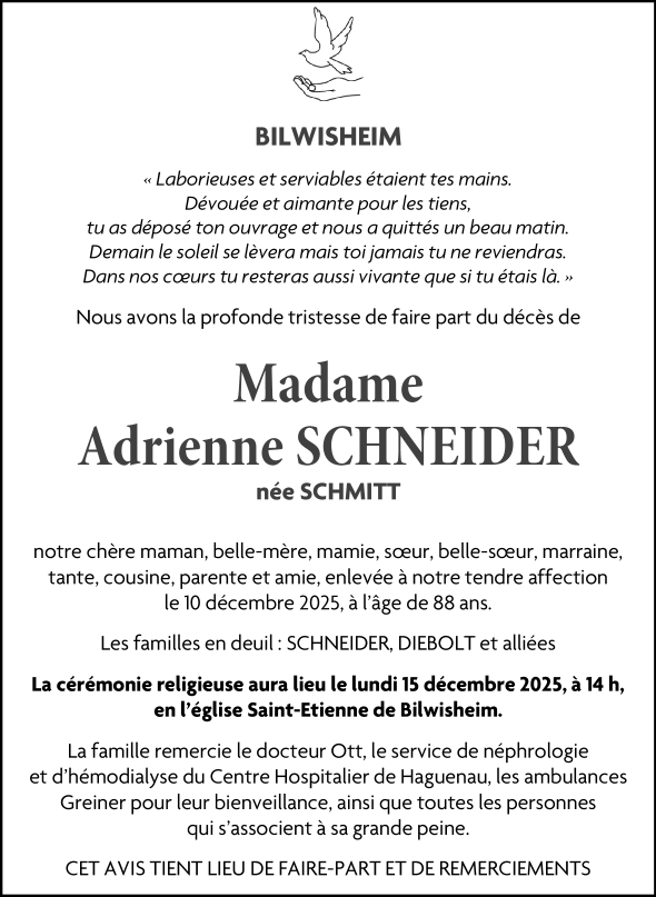 Décédée à Haguenau (67500, France) le mercredi 10 décembre 2025 à l'âge de 88 ans
