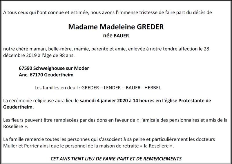 Décédée à Haguenau (67500, France) le samedi 28 décembre 2019 à l'âge de 98 ans