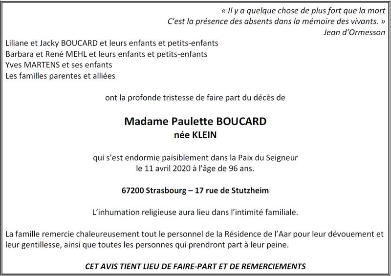 Décédée à Schiltigheim (67300, France) le samedi 11 avril 2020 à l'âge de 96 ans