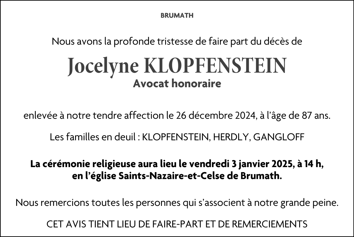 Décédée à Brumath (67170, France) le jeudi 26 décembre 2024 à l'âge de 87 ans