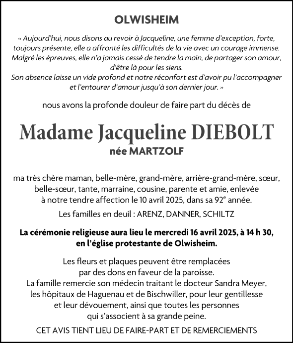 Madame Jacqueline Anne DIEBOLT née MARTZOLF